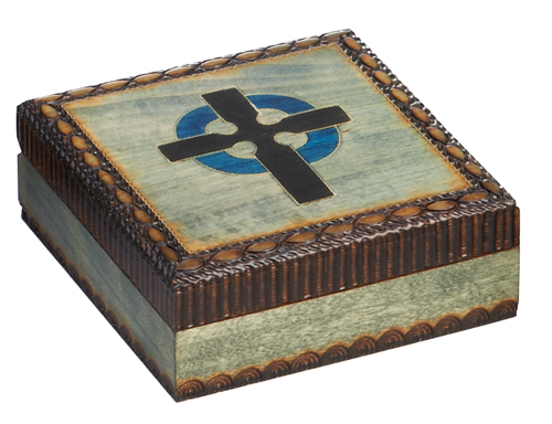 This unique box is decorated with a Celtic cross and finished with a blue stain. Additional burned detailing along the edges of the box complete the piece. Handmade in the Tatra Mountain region of Poland.