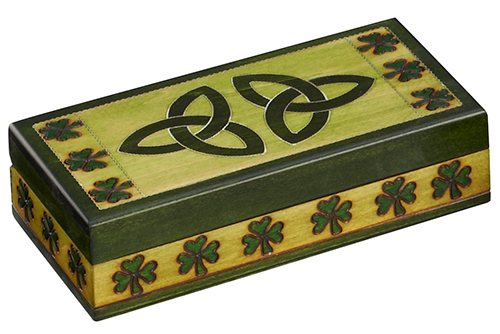 This box is decorated on the lid with a Celtic trinity knot. The edges of the lid and the sides of the box feature a shamrock motif. Two shades of green stain complete the piece. Handmade in the Tatra Mountain region of Poland.