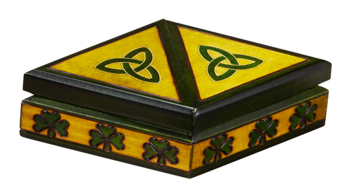 This unique, two-toned green box opens into two triangular compartments. Each lid is decorated with a trinity knot symbol, and the sides of the box feature a repeating shamrock design. Handmade in the Tatra Mountain region of Poland.