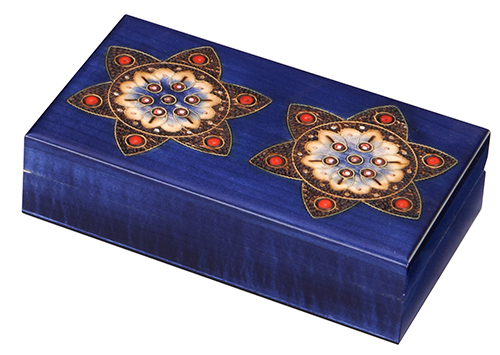 This beautiful and unique wooden box is stained in a deep blue hue and decorated with two floral-like designs on the lid. Handmade in Poland's Tatra Mountain region.