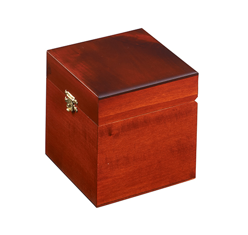 Simple, classic, cube shape with maple finish. A brass clasp secures the closed lid. Handmade in Poland's Tatra Mountain region.