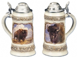 Stoneware, transfer decoration. Vivid full-color two-panel motif. A portrait of the buffalo is seen on the left side of the handle. The right side shows a full-scene presentation of the animal in its natural habitat. Each image is surrounded by an original elk horn design and raised-relief borders. Embossed, half-high pewter lid. Quoting James A. Meger: The North American buffalo (bison) is an amazing animal which captures the very essence of the plains of this great continent.