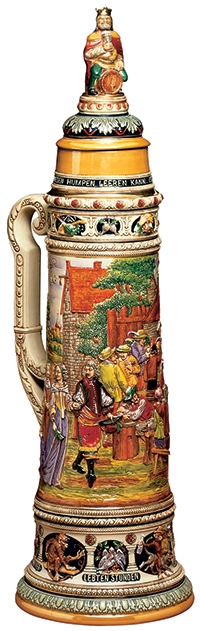 It stands 4 feet high, stoneware, weighs 35 pounds empty and holds 8.45 gallons! The scene is Flemish Country Wedding painting by Brueghel. Removable stoneware lid of Gambrinus, the German Beer King. Literal translation of the German verse is He who can empty this stein is truly a man!.