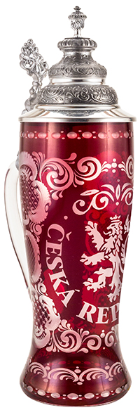 This great stein features a Czech Republika lion etching in the center surrounded by beautiful detailed patterns. Each stein is made by hand-etching into a thin layer of rich, transparent ruby colored glass that cases clear glass below. As the colored glass is methodically cut away, the clear glass underneath is revealed. The result is a beautiful stein with incredible detail. An ornate, detailed pewter lid provides a elegant finishing touch.