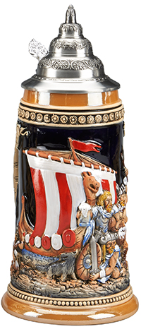 This traditional, full color, German stein pictures Viking explorer Leif Erikson in front of his ship. Very detailed! An ornamental pewter lid completes this handsome stein. This stein is also sold in an antique blue finish -- see item #4456.