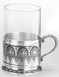 This Residenz tea glass has a pewter base which the glass rests in. The base is decorated with an elegant design, accented with Fleur De Lis. There is also a detailed handle.
