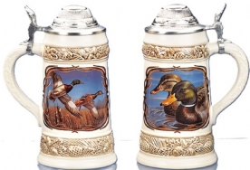 Stoneware, raised-relief and transfer decoration. Award-winning wildlife artist James A. Meger drew both full-color panels on this stein. A head portrait of a mallard drake and hen is shown on one side of the stein, and the other side shows the pair in full flight over a shoreline. Each panel is framed with an elk-horn design border. The stein features raised-relief top and bottom bands, consisting of pine cones, evergreen branches, oak leaves, and acorns. This pattern is repeated on the relief pewter lid. The thumblift is in the shape of an oak leaf.