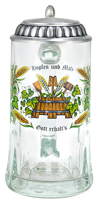 This traditional lidded glass stein has the words Hopfen und Malz" over a picture of a barrel. The words "Gott erhalt's" are beneath the barrel. Sprigs of hops and malt frame the picture.