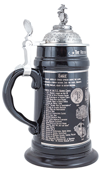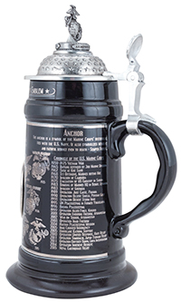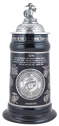 This stein features the United States Marine Corps Globe and Anchor logo as a metal medallion on the front/center of the stein body. Left side of stein describes symbolism of the eagle, center of stein describes symbolism of the globe, and the right side of the stein describes the symbolism of the anchor. A timeline on the left and right side of the stein provides an overview of the history of the logo, from its inception through the version used today. These various iterations of the logo are shown on either side of the medallion. The lid features a three-dimensional, sculpted Globe and Anchor.