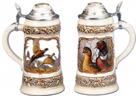 Stoneware, raised-relief and transfer decoration. James A. Meger created the original images presented on this stein. The head portrait shows the pheasant cock and hen while the other panel shows them in flight over an empty field. Elk horns frame both panels. The stein features raised-relief top and bottom bands, consisting of pine cones, evergreen branches, oak leaves, and acorns. This pattern is repeated on the relief pewter lid. The thumblift is in the shape of an oak leaf.