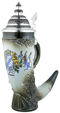 This lidded stoneware horn is decorated with a Bayern flag and coat of arms design on the front. Raised-relief leaves adorn the base of the horn and its rim.