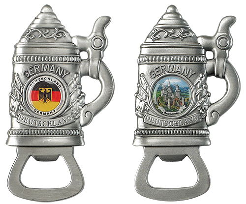 Assorted metal beer stein bottle openers. These zinc alloy openers read "Germany" across the top and "Deutschland" on the bottom. The center features either a German flag motif or a Neuschwanstein castle motif.