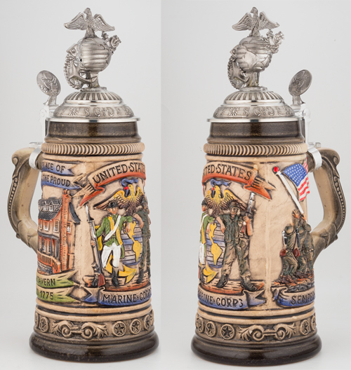 This stein shows Marines from past and present and is topped with a decorative pewter lid featuring the U.S. Marine Corps emblem.