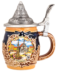 This miniature stoneware stein is decorated with a large city scene (assorted) ,surrounded by a raised-relief border. It is topped with a conical pewter lid.