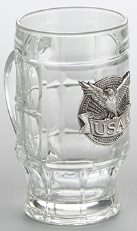 This classic strassburg glass mug is decorated with an embossed pewter applique; featuring a proud bald eagle perched upon a USA banner.