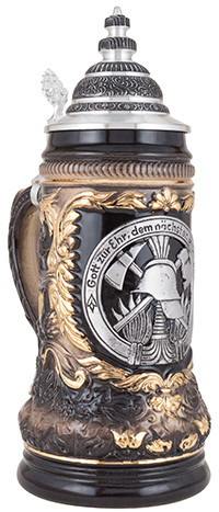 This handsome black and gold stoneware stein is decorated with a pewter applique which honors the profession of firefighting. The pewter medallion features a fire hose, flame, helmet, and ax symbol and includes the German phrase, "Gott zur Ehr, dem Nachsten zur Wehr," which roughly translates to, "The glory of God and the protection of our neighbors." A beautiful ornamental pewter lid completes the piece.