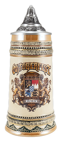 This classic stein is decorated with a Bayern crest design, with "Munchen" underneath it and "Oktoberfest" above it. A pewter lid completes the item.