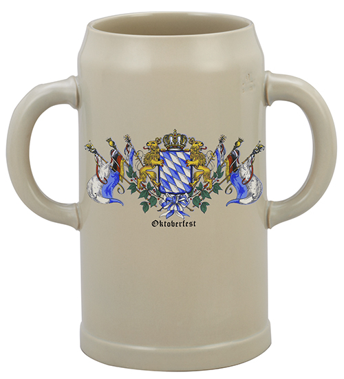 This giant 5.0L mug makes a great conversation piece. It features handles on either side and the Bavarian crest on the front, along with the word Oktoberfest". "