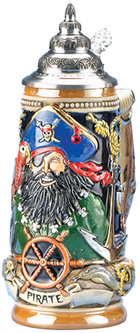Stoneware, hand-painted raised relief decoration. This stein features a pirate enjoying life at sea with a parrot on his shoulder and the wind in his beard. Limited edition of 10,000 pieces.