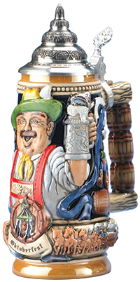 Stoneware, hand-painted raised relief decoration. This stein features a Bavarian man with a beer in one hand and a pretzel in the other enjoying Oktoberfest. Men chopping wood and rolling barrels adorn the sides of the stein and two beerwagons converging on an Oktoberfest banner encircle the base. A conical pewter lid decorated with beerwagons and harvest grains, and a handle composed of beer barrels completes the piece. Limited edition of 10,000 pieces.