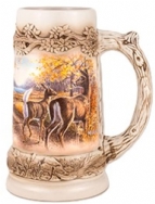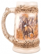 This stoneware stein displays two images of deer. One is a full-body depiction of a male deer with antlers, standing motionless; the other is of a pair of does walking in a wooded area. These scenes are bordered by raised-relief branches and flowers. The perfect gift for any nature lover.