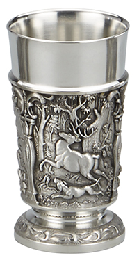 This detailed pewter shot glass depicts a deer running through the forest as it is hunted by dogs and hunters.
