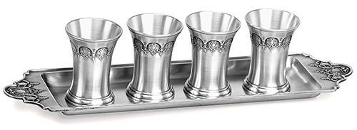This set of four classy pewter shot glasses are decorated with an elegant design, accented with Fleur De Lis around their flared lips. The set comes complete with a rectangular serving tray.