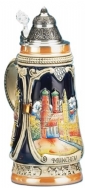 Stoneware, hand-painted raised relief decoration with rose gold leaf accents. This three paneled, tapered stein features some of Munich's most popular attractions. To the left we have a close up of the Glockenspiel scene; in the middle is a view of Marianplatz featuring the Neues Rathaus (New Town Hall); and to the right is Hofbrauhaus, the most famous beer hall in the world. The base of the stein is bordered by a parade of beer wagons and an ornate conical pewter lid completes the stein. Limited edition of 10,000 pieces.