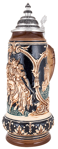 On the front of this stein, lovers share a passionate embrace while riding a pair of horses. The stein has an antique finish, and a domed pewter lid completes the piece. This authentic German stein was made from a mold acquired from the original factory of Simon Peter Gerz.