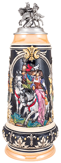On the front of this stein, lovers share a passionate embrace while riding a pair of horses. The stein is in multicolor, and a pewter lid topped with a figurine of a couple on horseback completes the piece. This authentic German stein was made from a mold acquired from the original factory of Simon Peter Gerz.