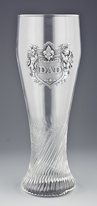 Our classic pilsner glass with a twist. This stunning twist bottom pilsner glass comes with a pewter badge that reads "DAD".
