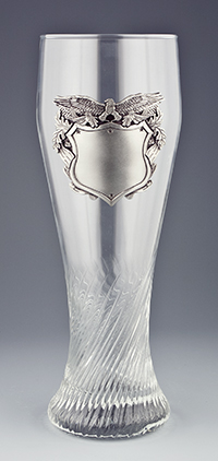 Our classic pilsner glass with a twist. This stunning twist bottom pilsner glass comes with a pewter partiotic badge, which features an eagle over a blank area ideal for engraving.