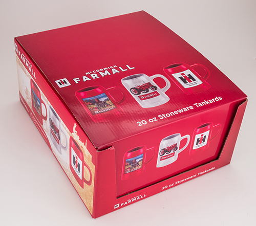This display is great way to easily and attractively market your IH diner mugs! The top of the full-color IH case folds back to instantly create the display and showcase the set of six assorted mugs inside. The mug set includes two each of items6582 (red mug with IH logo), 6854 (red mug with farm scene), and 6855(white mug with vintage Farmall tractor logo). The mugs are crafted from high-quality stoneware and each hold 0.50L. This is an officially licensed product.