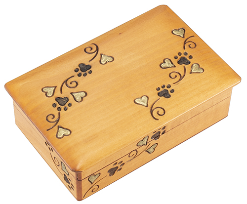 This elegant rectangular box is decorated with twin vines that are made up of hearts and paw prints. The vines climb across the top and over the sides of the box.