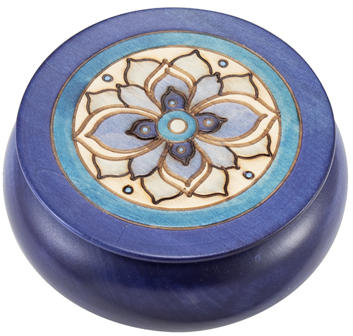 This unique round wooden box has a lid that is decorated with a symmetrical blue flower.
