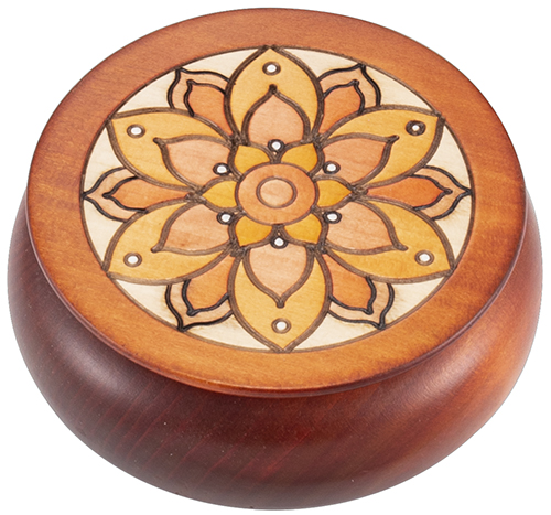 This unique round wooden box has a lid that is decorated with a symmetrical golden brown flower.