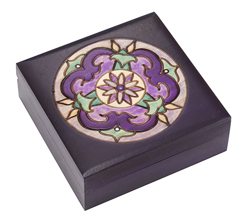 This unique wooden box has a lid that is decorated with a purple flower surrounded by a colorful geometric pattern.