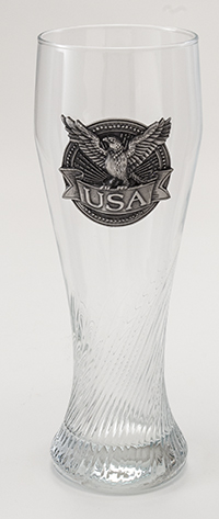 This half liter, riegsee-style pilsner has an optical spiral glass body. The front of the pilsner glass features an embossed pewter applique; that depicts an eagle clutching a USA banner in its talons.