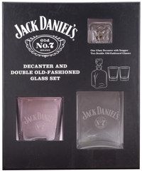 This gift set includes one decanter and two DOF glasses, all of which are decorated with Jack Daniel's etch white bug logo. The set comes in a sleek, black gift box. Officially licensed product.