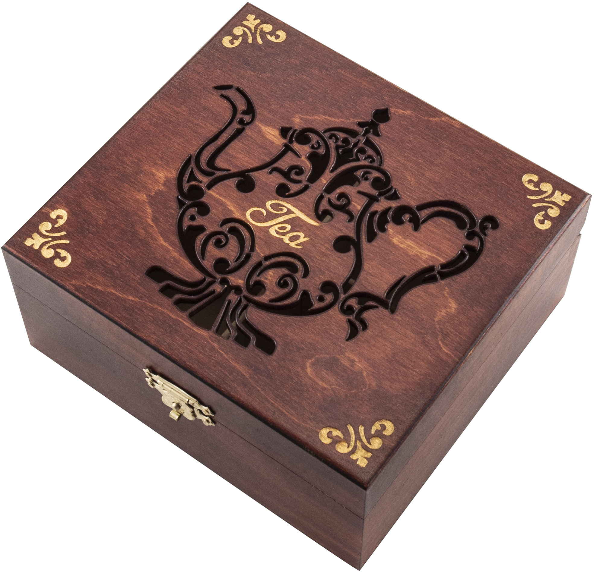 This box from the Tatra Mountain region of Poland is perfect for holding tea. Its lid features a teapot with the word "Tea" in gold script.
