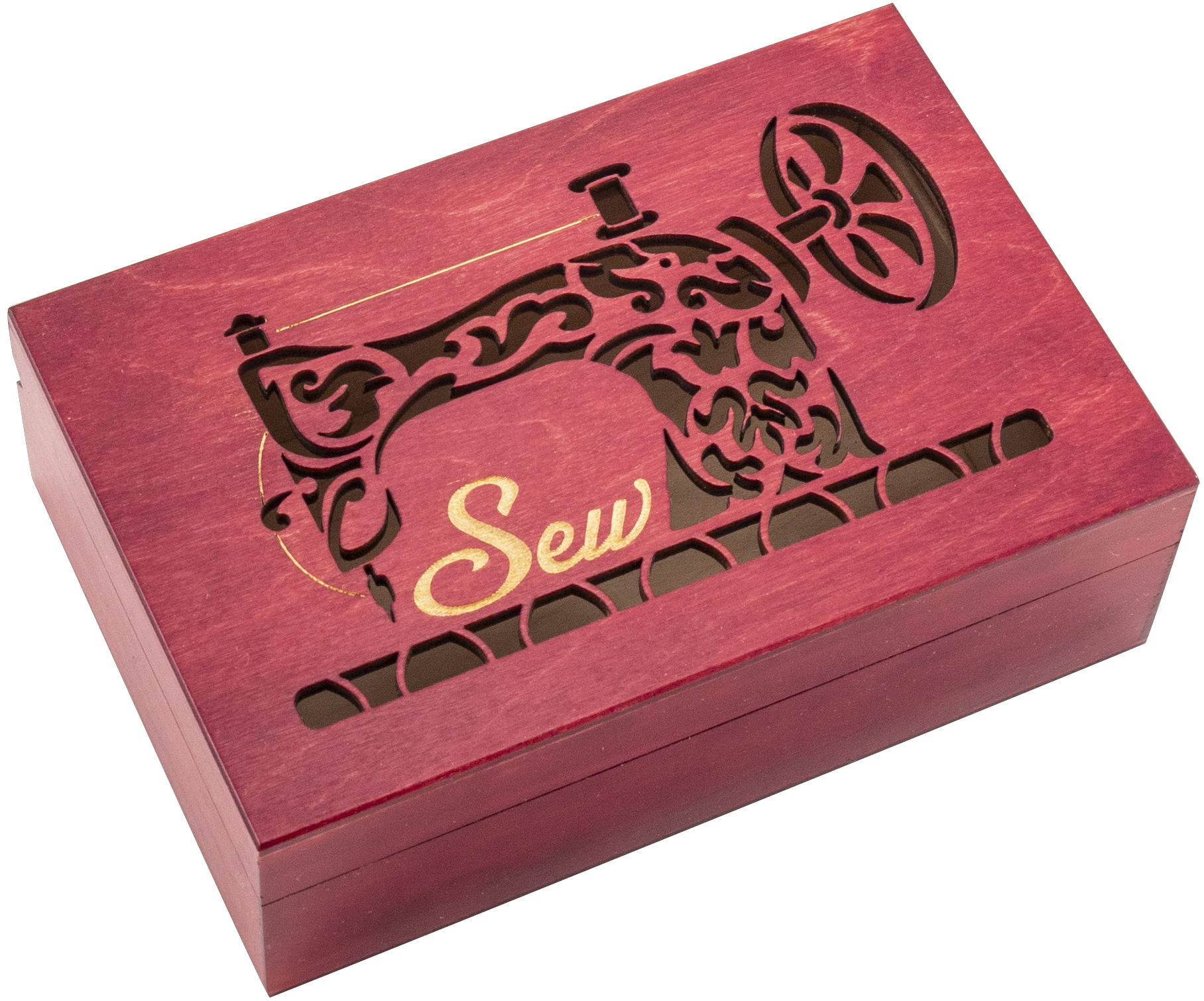 This box from the Tetra Mountain region of Poland is perfect for holding sewing supplies. Its lid features a sewing machine with the word "Sew" in gold script. You can conveniently see the box's contents through the cut-out design on the lid.