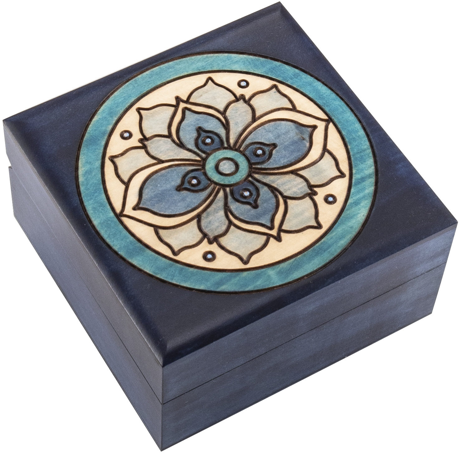 This unique wooden puzzle box has a lid that is decorated with a symmetrical blue flower. The feet of the box twist to unlock the lid.