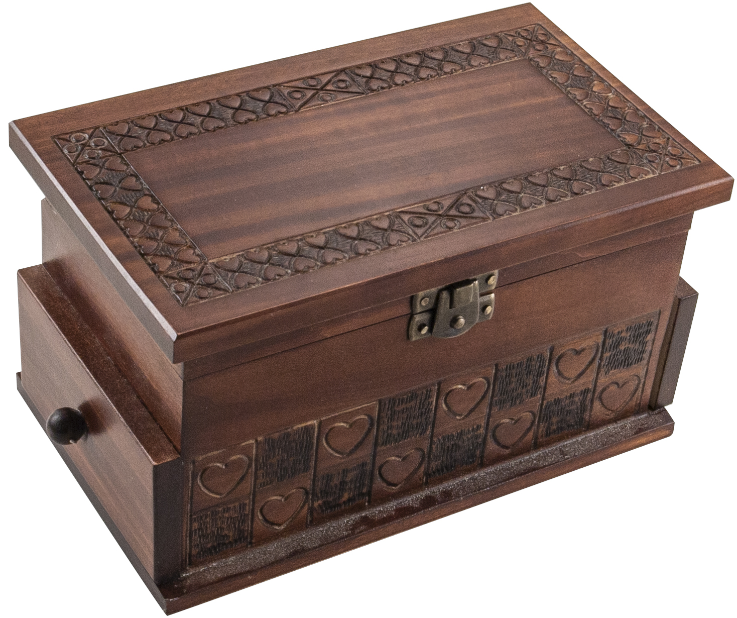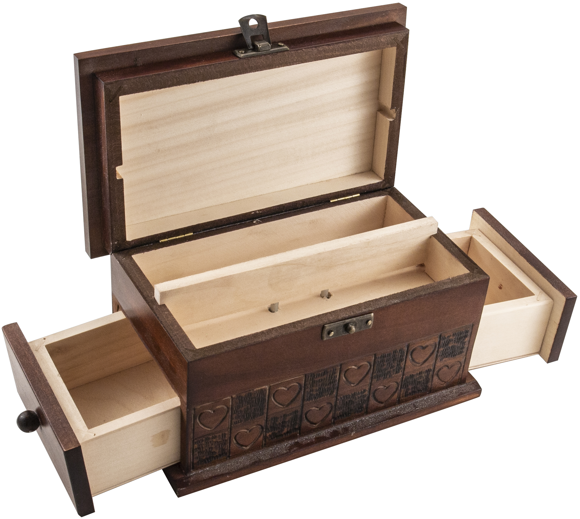 This rustic trick box is decorated on its lid with a border of small hearts. Larger hearts decorate the front of the box.