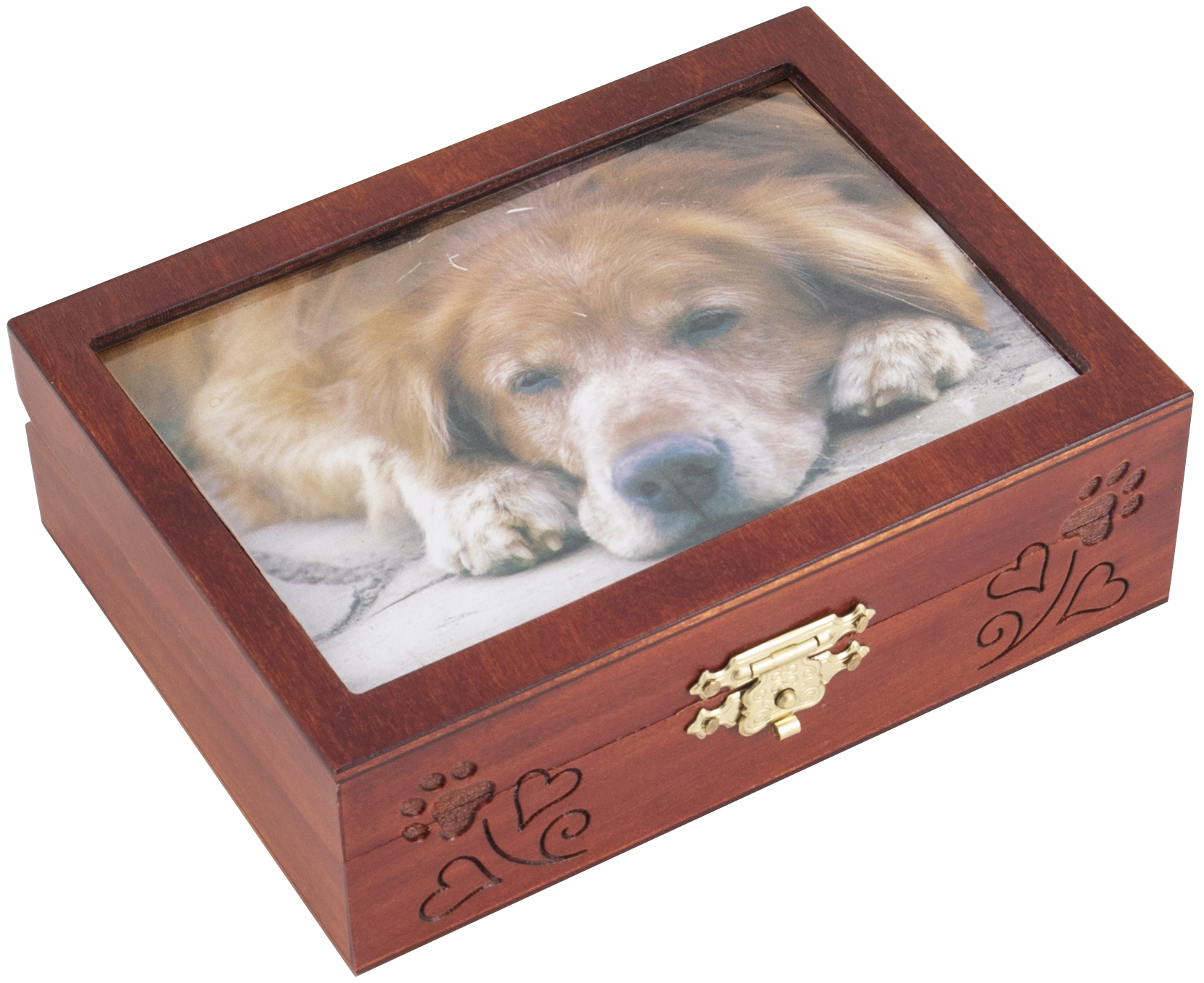 The top panel of this box has a flexible acrylic cover that can be removed to insert a photograph. Hearts decorate the front of the box. It is secured with a latch.