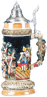 This dynamic stein has created a great deal of excitement with many unique qualities. First it has an unusual flared base featuring the word Gemuetlichkeit meaning friendship, enjoyment, fun and togetherness. The double relief body design depicts a musical band performing numerous instruments. Dancing couples are the side motifs. The innovative three-dimensional handle is shaped like a mountain climber. Conical pewter lid.