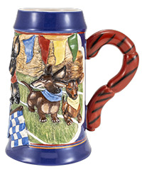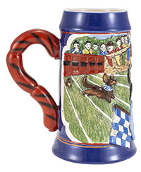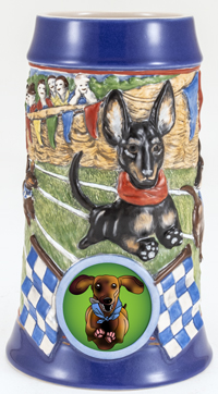 This 25 oz mug depicts the adorable Oktoberfest tradition of dachshund racing. Dachshunds race accross the mug infront of a crowd of spectators. A leaping dachshund decorates the front shield area, and a sausage handle completes the piece.