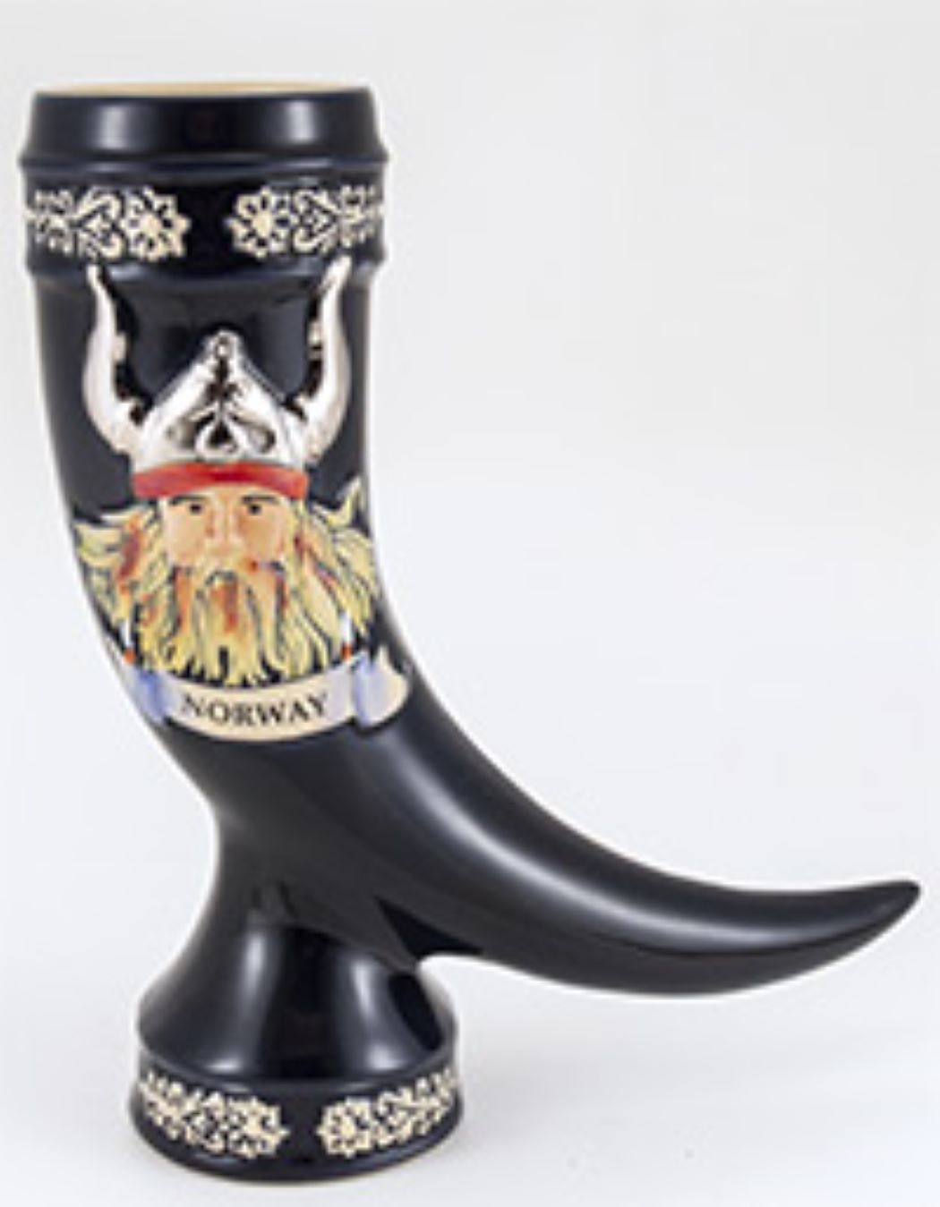 This black stoneware horn is decorated with the image of a Viking, with a banner that reads "Norway" underneath it. A raised-relief design circles the mouth and base of the horn.