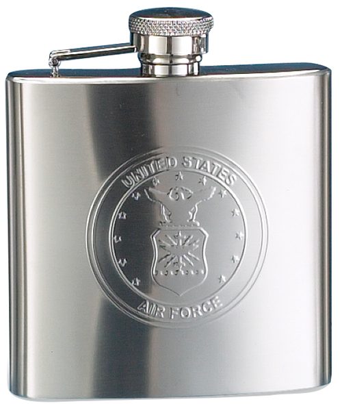 Stainless Steel, brushed finish. This 6 ounce flask features an embossed US Air Force emblem and a captive top. Officially Licensed Product.