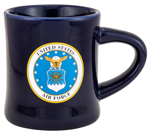 Dark blue diner-style mug featuring the circular United States Air Force decal logo on one side. This is a heavy weight, quality mug.