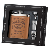 This gift set includes a hip flask, two stainless steel shot glasses, and a flask funnel. The flask has a brown leather wrap with a Jack Daniel's Label logo on the front of the flask with captive top. The shot glasses are decorated with the Jack Daniel's Swing logo on one side and the Old No. 7 button logo on the other. The flask funnel is engraved with "Jack Daniel's," and a stylish black gift box completes the item. Official licensed product.